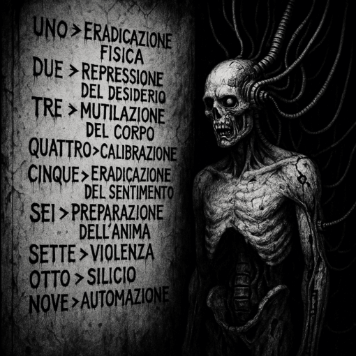 Aldilà del confine collegato, esistono calpestabili materassi in canapa grigia riverse sui quali lamentose partorienti, inseminate da cavallette mangia-ozio (lavoratrici senza diritto di sciopero), soffocano sotto il peso di pance gonfie. Vomitano dagli orifizi cellulosa di strati epidermici privi di collagene – telomeri a densità-zero assorbiti in mutazioni genetiche -. Alcune fiche slabbrate da canne di fucile ed ami da pesca. Essicatoi per feti morenti; posti con dedizione collezionistica.